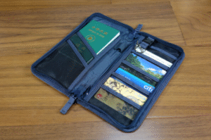 護照、電子機票影印本、住宿單、旅行計畫表、醫療保險證明、信用卡、現金、 2張照片等放在護照包中。過海關時,需要任何證件時可以立刻由護照包中拿出來,就不用在海關面前浪費時間找證件。